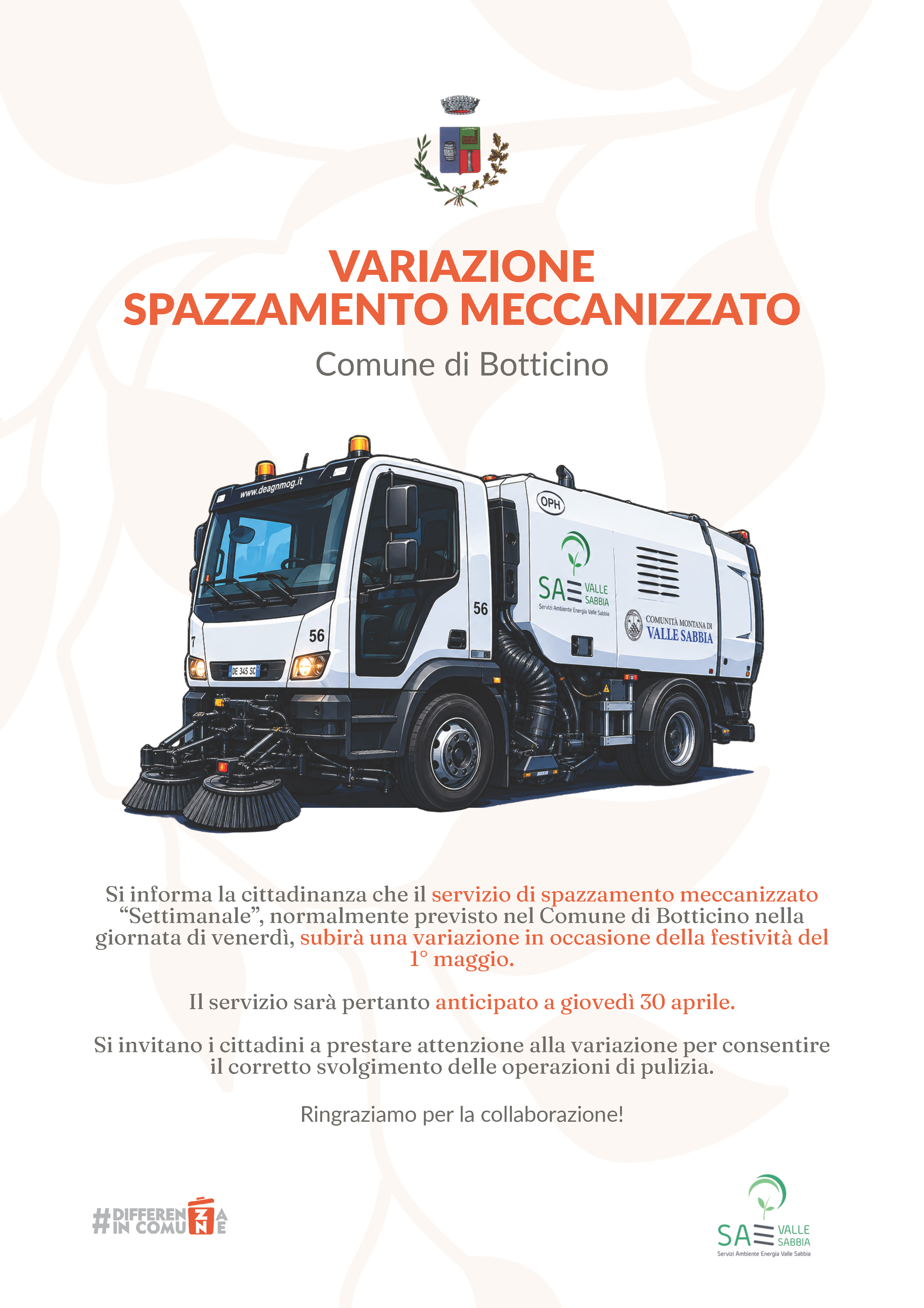 Si informa la cittadinanza che il servizio di spazzamento meccanizzato “Settimanale”, normalmente previsto nel Comune di Botticino...